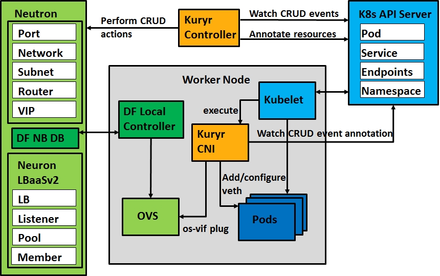 Kuryr 是 OpenStack Neutron 的子项目,其主要目标是透过该项目来集成 OpenStack 与 Kubernetes 的网络。该项目在 Kubernetes 中实作了原生 Neutron-based 的网络,因此使用 Kuryr-Kubernetes 可以让 OpenStack VM 与 Kubernetes Pods 能够选择在同一个子网络上运作,并且能够使用 Neutron L3 与 Security Group 来对网络进行路由,以及阻挡特定来源 Port,并且也提供基于 Neutron LBaaS 的 Service 集成。